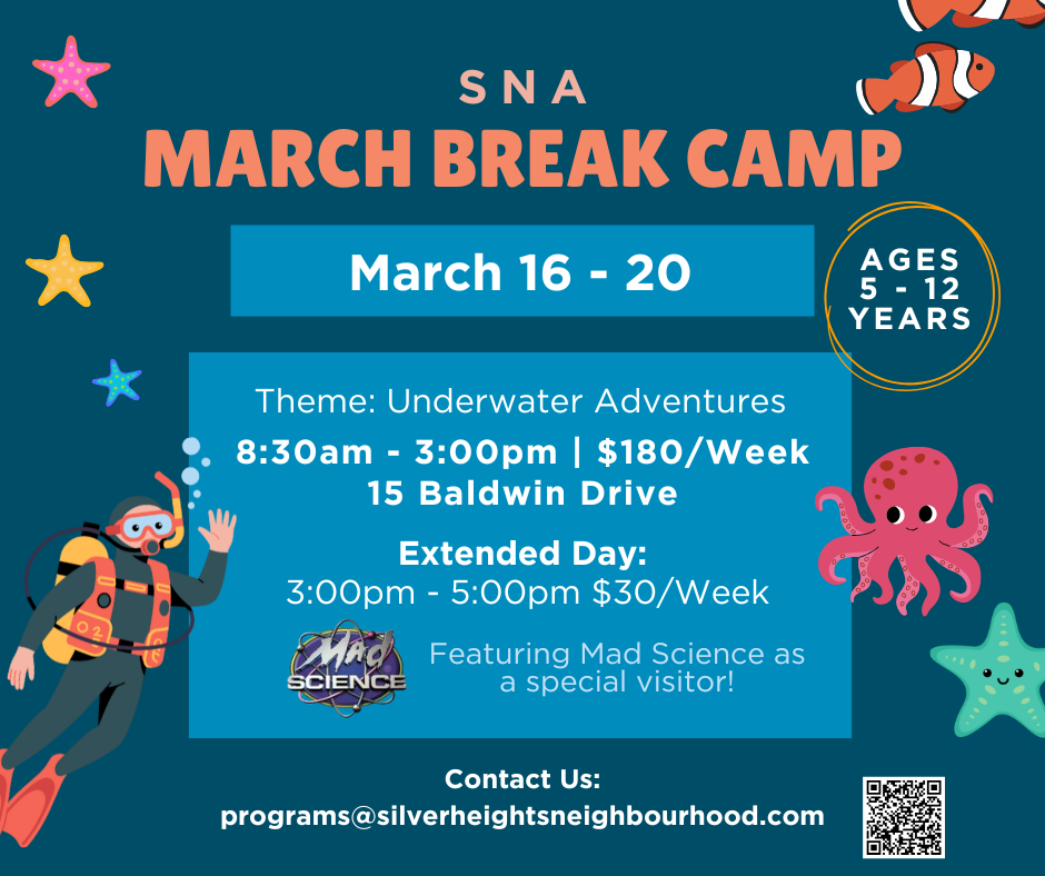 March Break Camp runs March 16 – 20 at 15 Baldwin Drive. Open to ages 5 – 12. *Please note that participants must be born in 2021 or earlier*